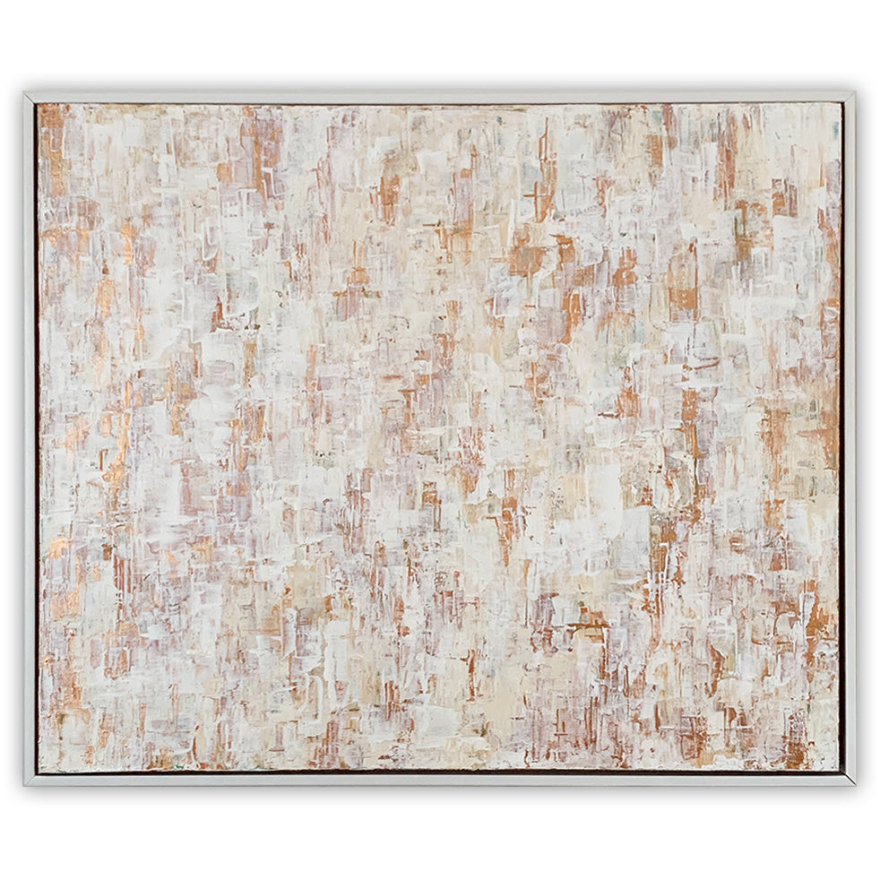This 24x20" acrylic painting by artist Andrea Smith is an abstract original on 1.5" deep gallery wrapped canvas. The canvas edges are painted bronze to match. This painting is framed in a white float frame for a finished look, wired, and ready to hang.