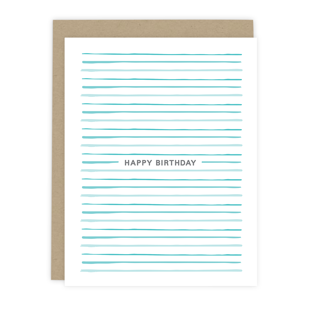 The Cabana Stripe birthday card shows off an aqua blue / green pattern of watercolor stripes and dark gray "happy birthday" text. Ideal for boys and girls of all ages, this simple card is the perfect way to show you care and support local US businesses all the way from the paper manufacturing to the printing. Each card is crafted on sturdy white cover stock and paired with a light gray A-2 envelope.