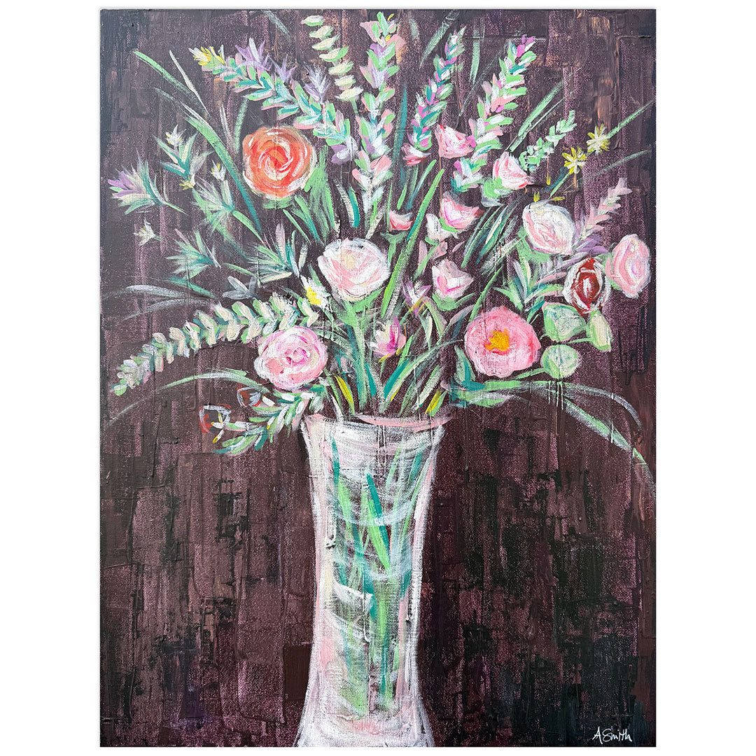 This 18" x 24" acrylic painting on canvas by artist Andrea Smith is an abstract original acrylic painting on 1.5" deep gallery-wrapped canvas. Edges are painted white to match. This painting is wired and ready to hang, no frame required.