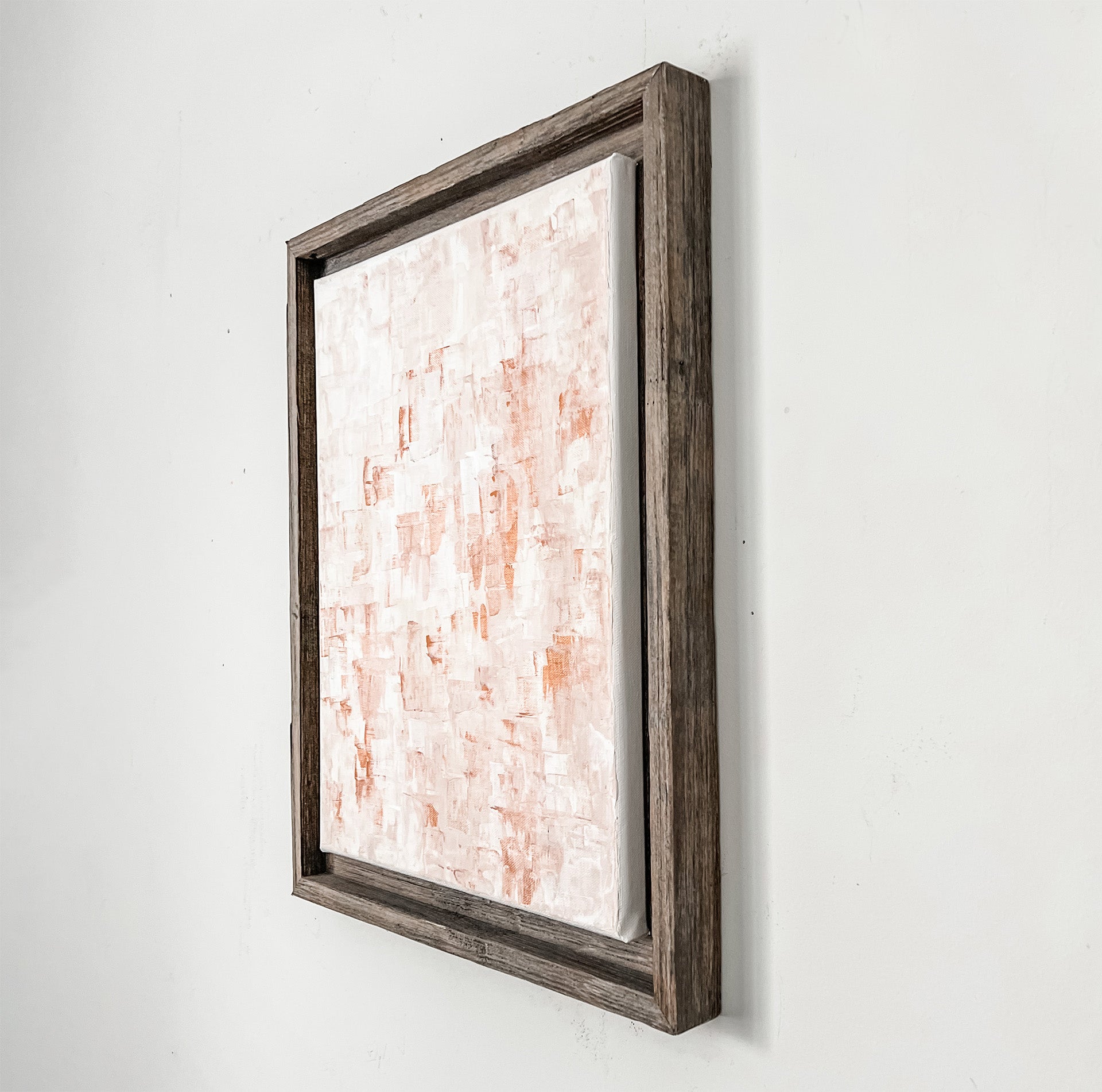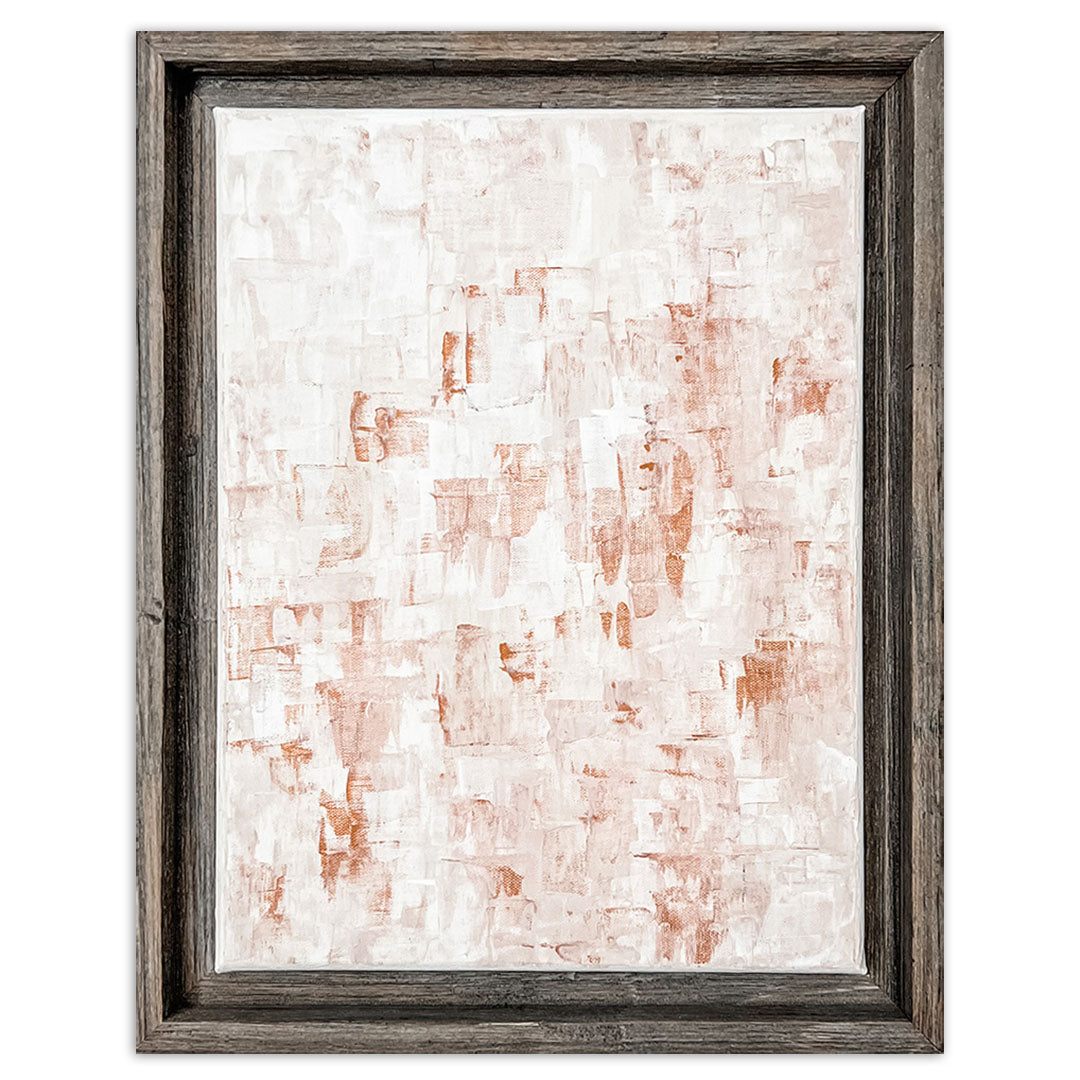 This 12x16" acrylic painting by artist Andrea Smith is an abstract original. The canvas edges are painted white and the piece is finished with a distressed gray barnwood float frame. This painting is wired and ready to hang.