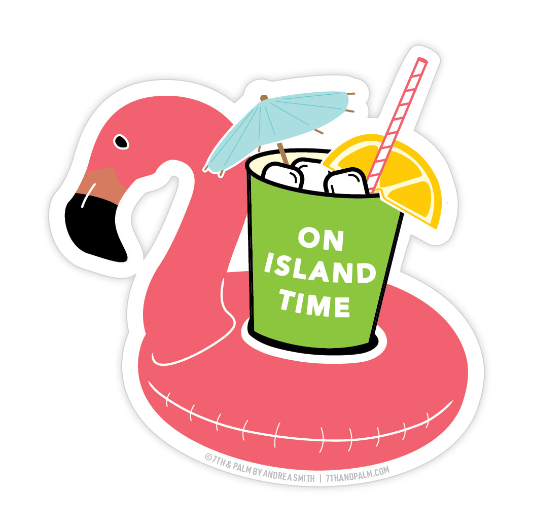 Custom "on island time" pink flamingo float and tropical drink illustration created by artist Andrea Smith. Use this sticker to decorate your laptop, planner, smartphone, water bottle, or send as a gift to a friend and brighten their day.
