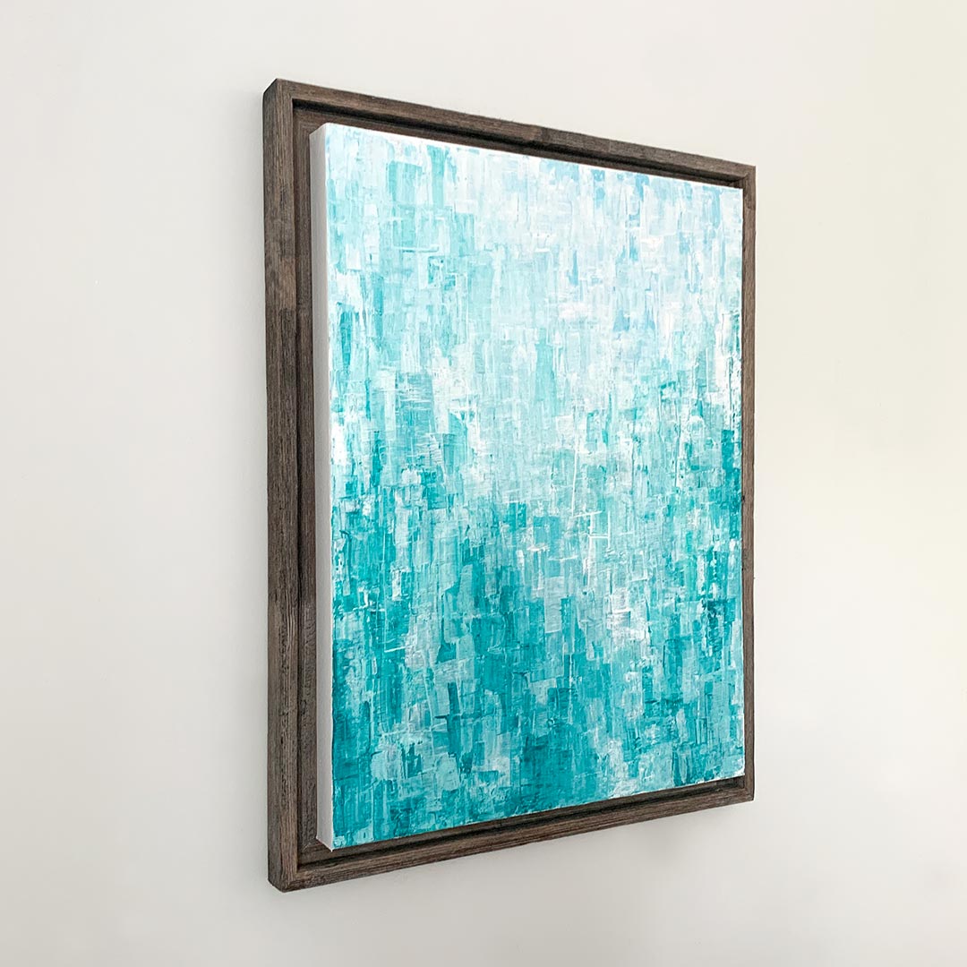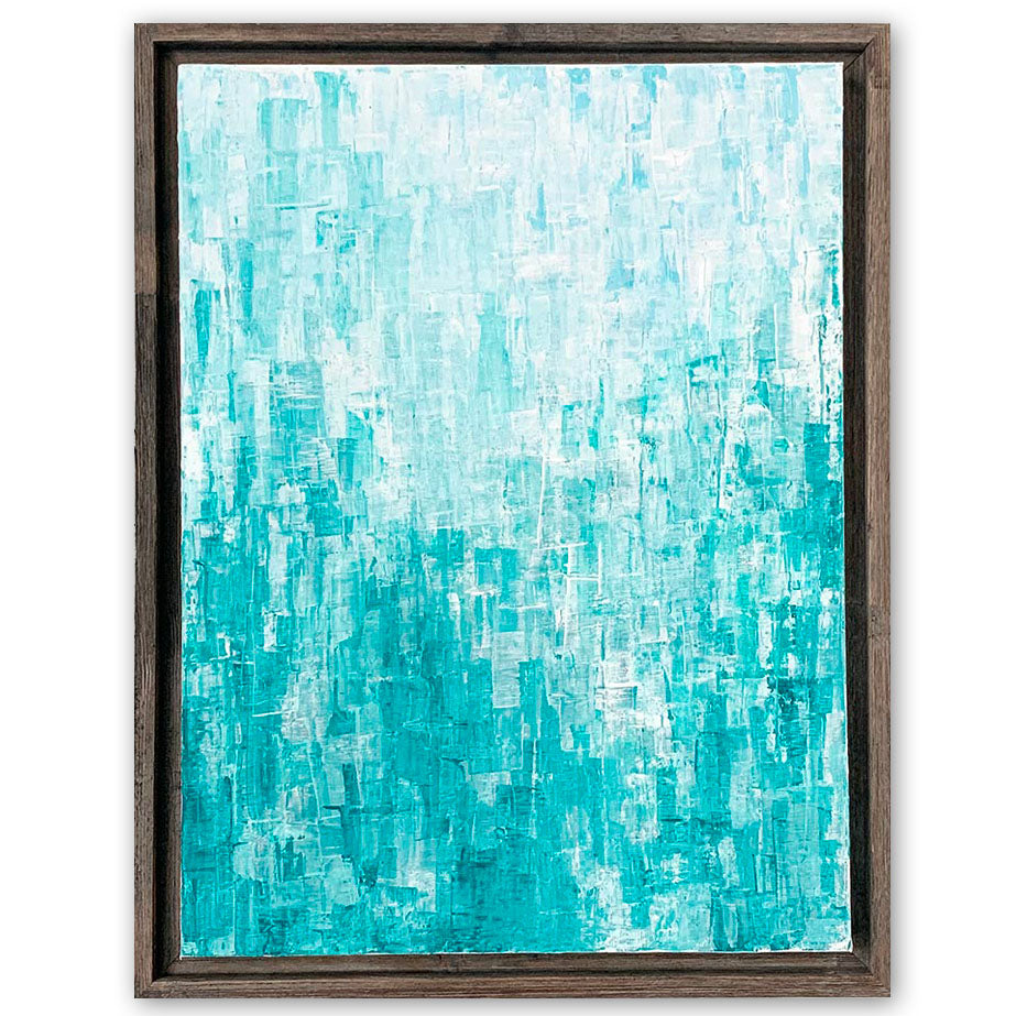 This 18x24" acrylic painting by artist Andrea Smith is an abstract original on 1.5" deep gallery wrapped canvas. The canvas edges are painted white and the piece is finished with a distressed gray barnwood float frame. This painting is wired and ready to hang.