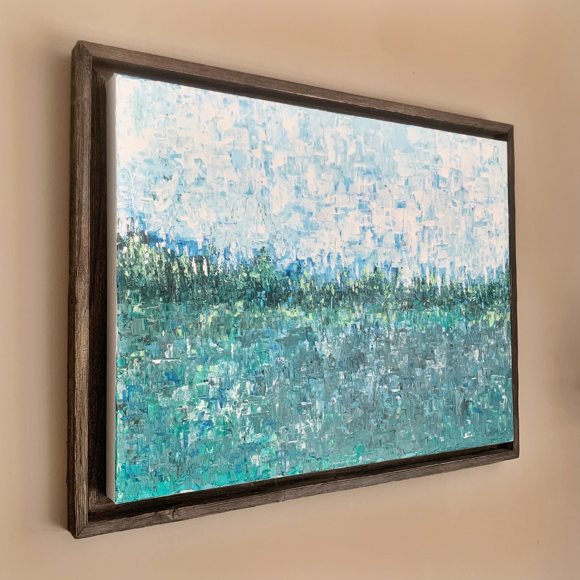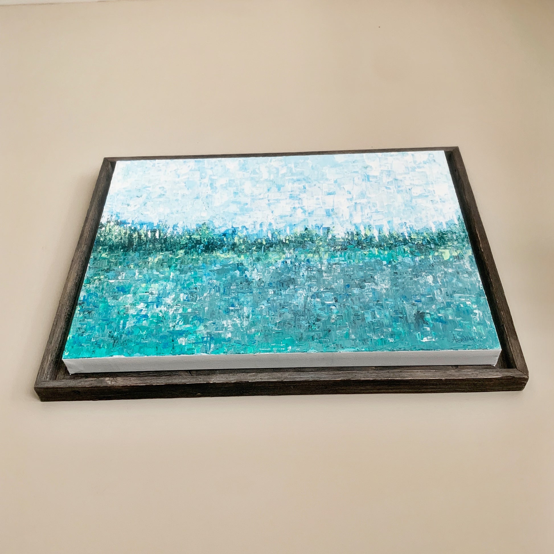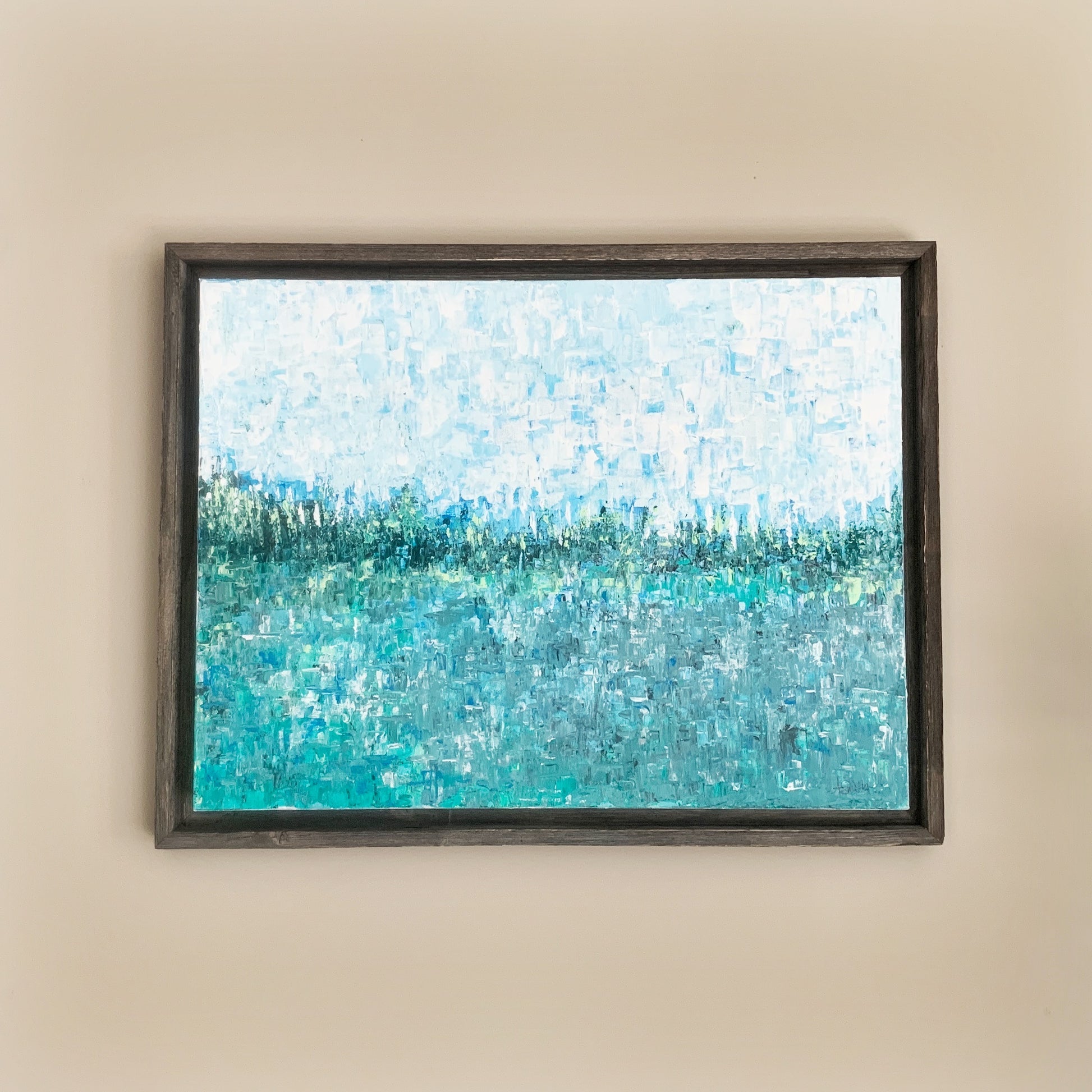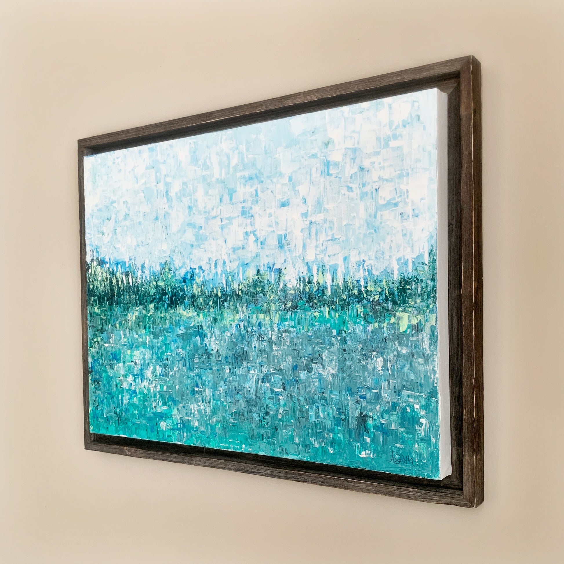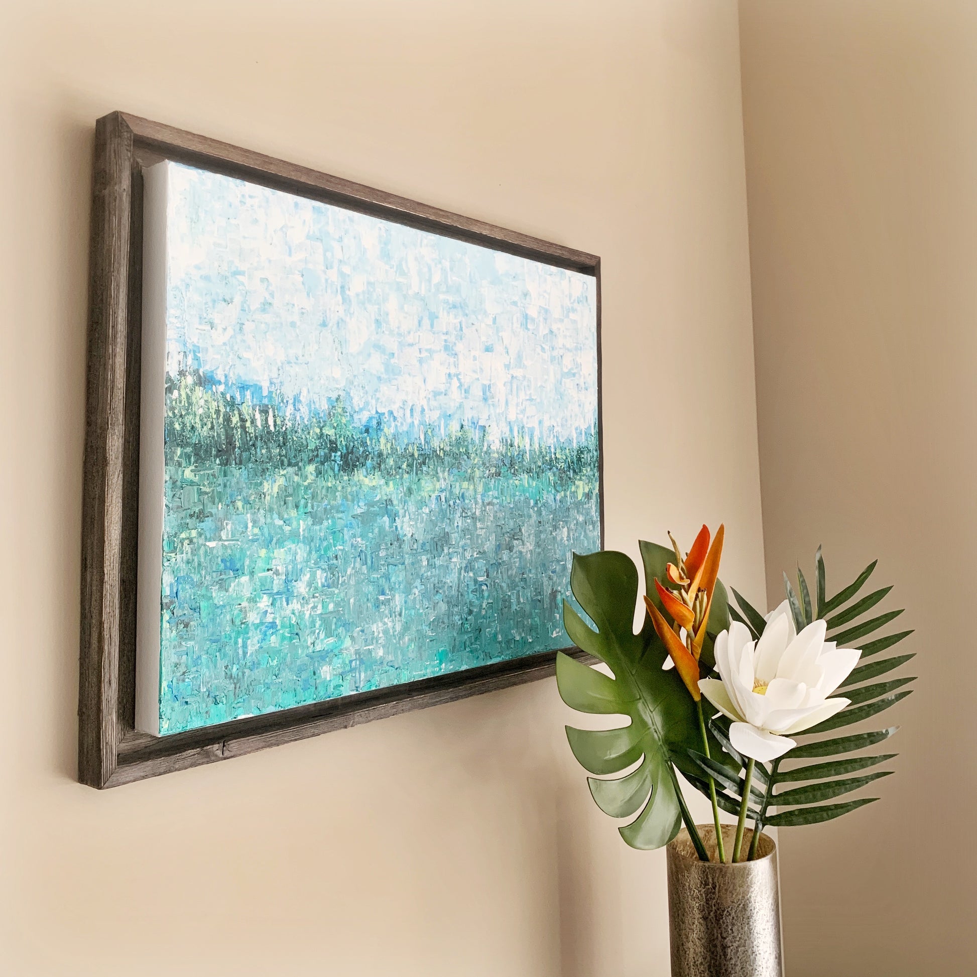 The canvas edges are painted white and the piece is finished with a distressed gray barnwood float frame, measuring 27x21". This painting is wired and ready to hang.