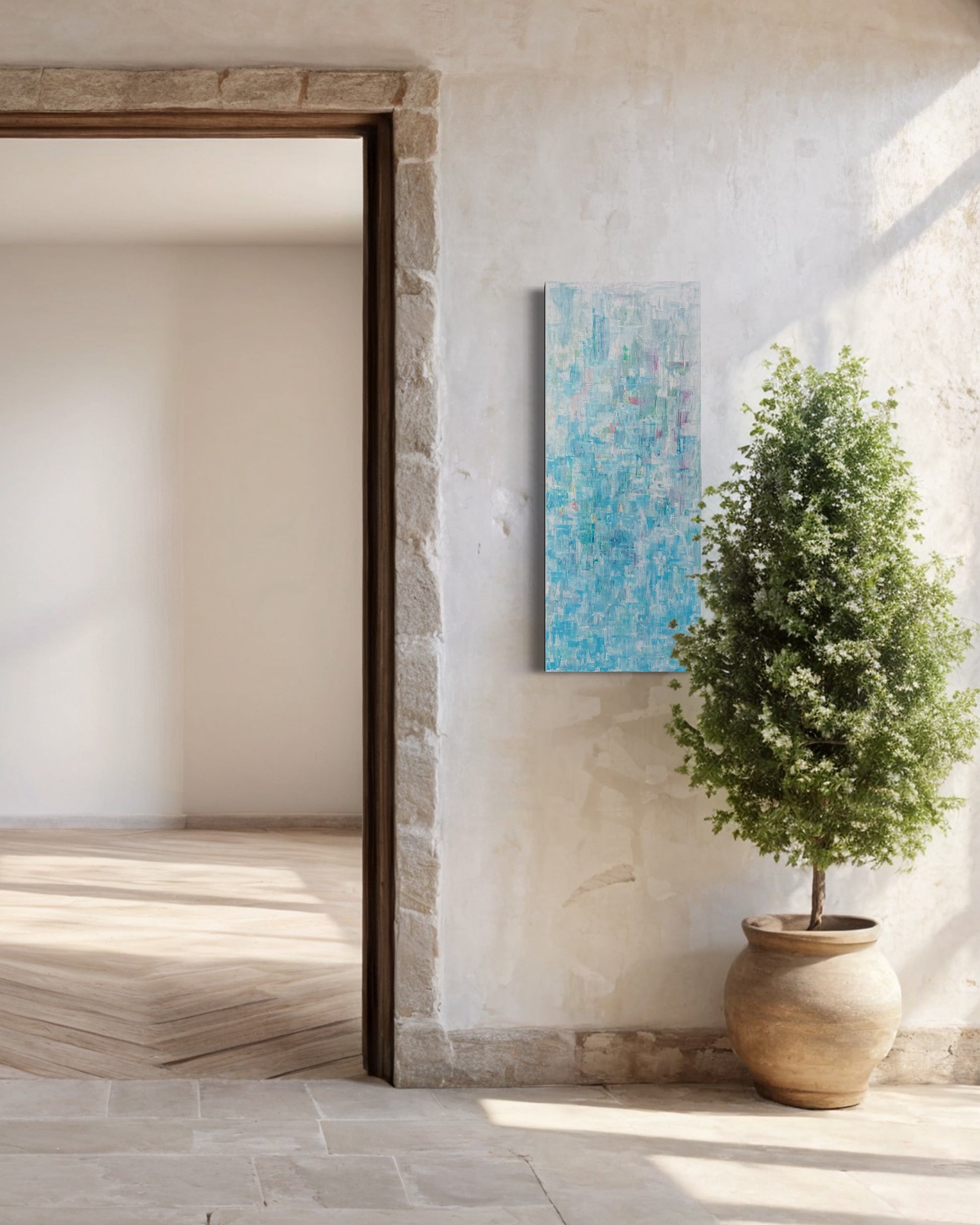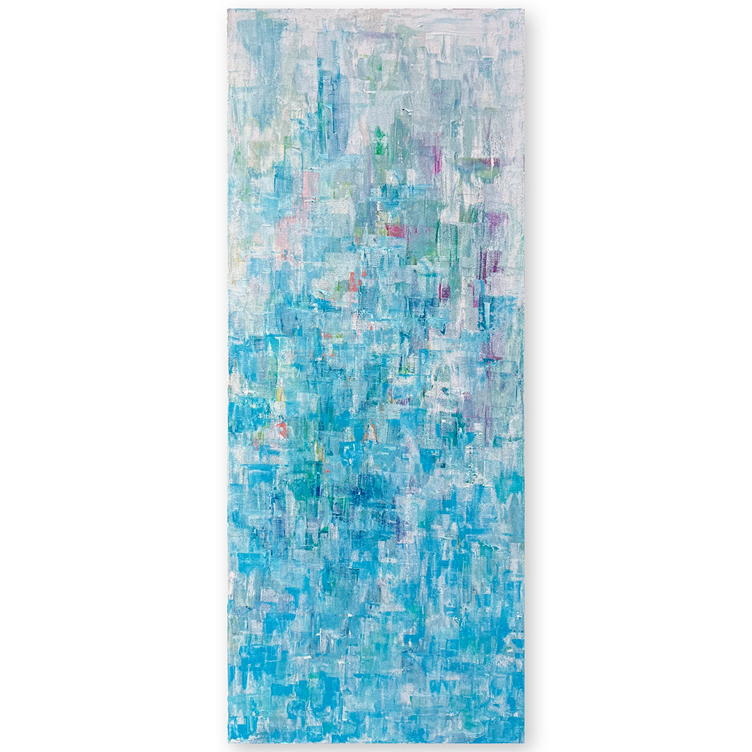 This 16 x 40" abstract acrylic painting on canvas by artist Andrea Smith is on 1.5" deep gallery wrapped canvas. The edges are painted white to match. This painting is wired and ready to hang, no frame required.