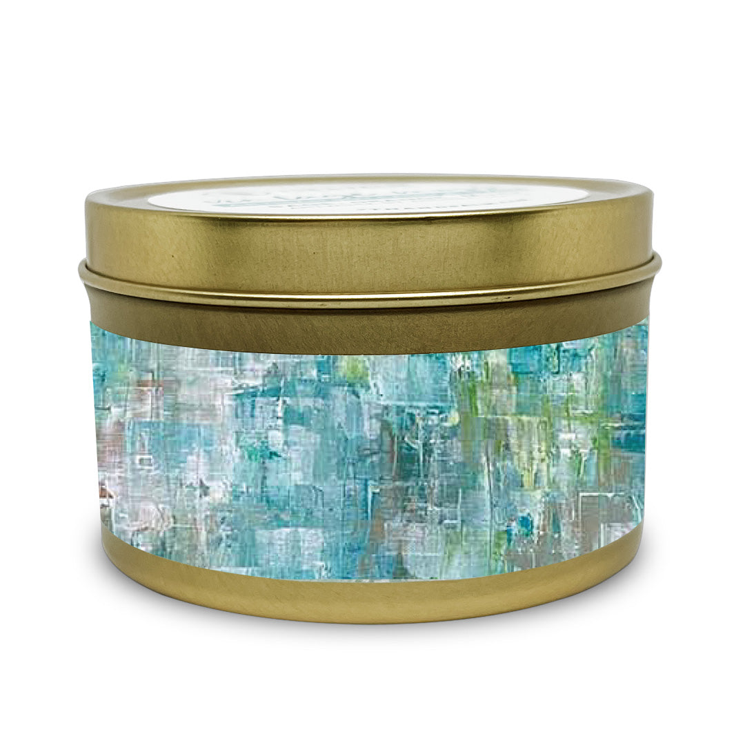 Premium soy wax candles come in 7 oz gold travel tins with a burn time of 40-50 hours, featuring a colorful print of original artwork by Andrea Smith. Hand-poured in small batches using 100% pure soy wax from soybeans grown in the USA and premium fragrances, each candle is vegan, not tested on animals, and paraben-free, phthalate-free, dye-free, and lead-free. Wicks are 100% cotton and tins are 100% recyclable.