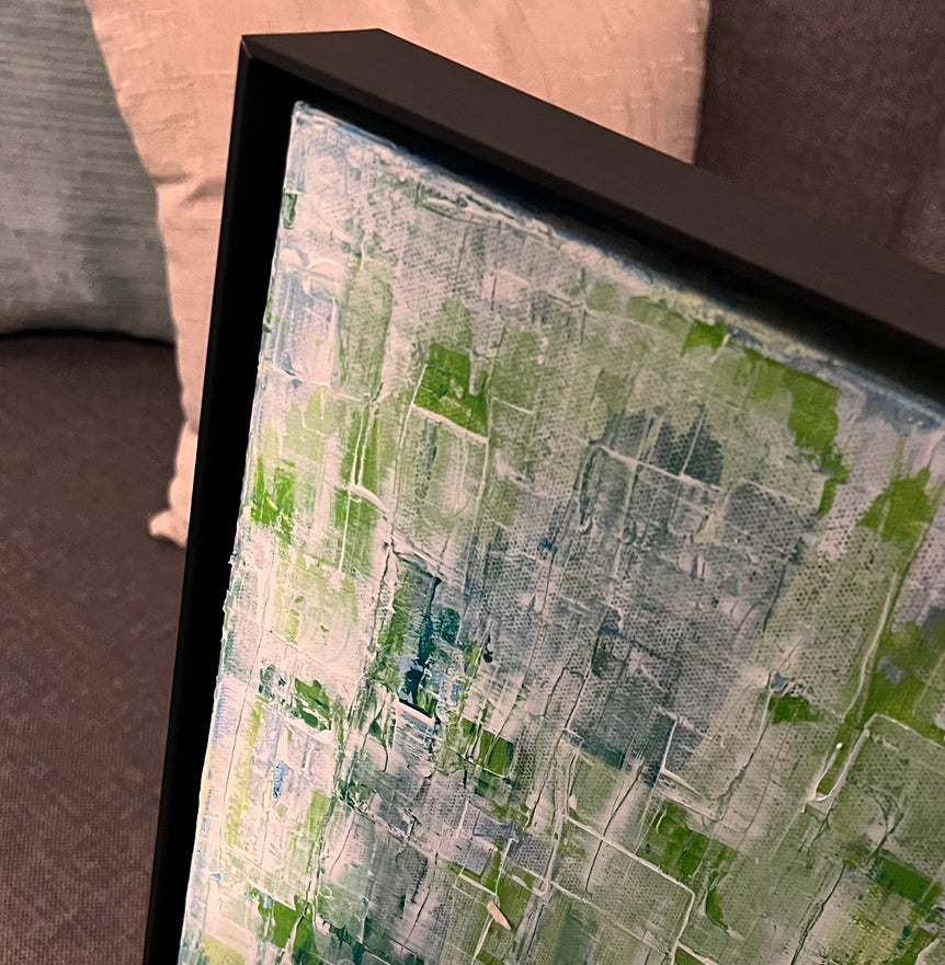 This 48 x 36" acrylic painting by artist Andrea Smith is an abstract original on 1.5" deep gallery-wrapped canvas. The edges are painted to match. This painting includes a black metal float frame.